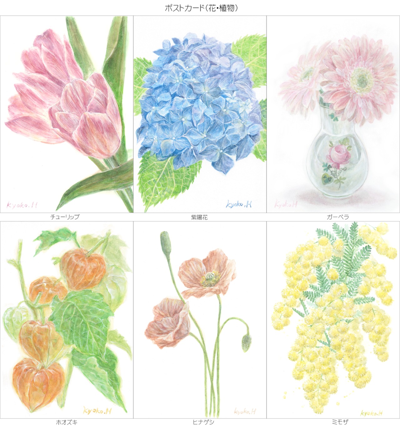 ■ポストカード(花・植物)……各100円(税抜) チューリップ、紫陽花、ガーベラ、ホオズキ、ヒナゲシ、ミモザ、ビオラ、桜、ラナンキュラス、椿、百日草、アネモネ、紫と緑の花束